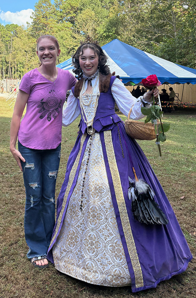 student and a patron in a purple renaissance dress