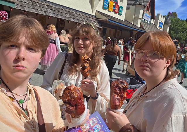 three students holding turkey legs